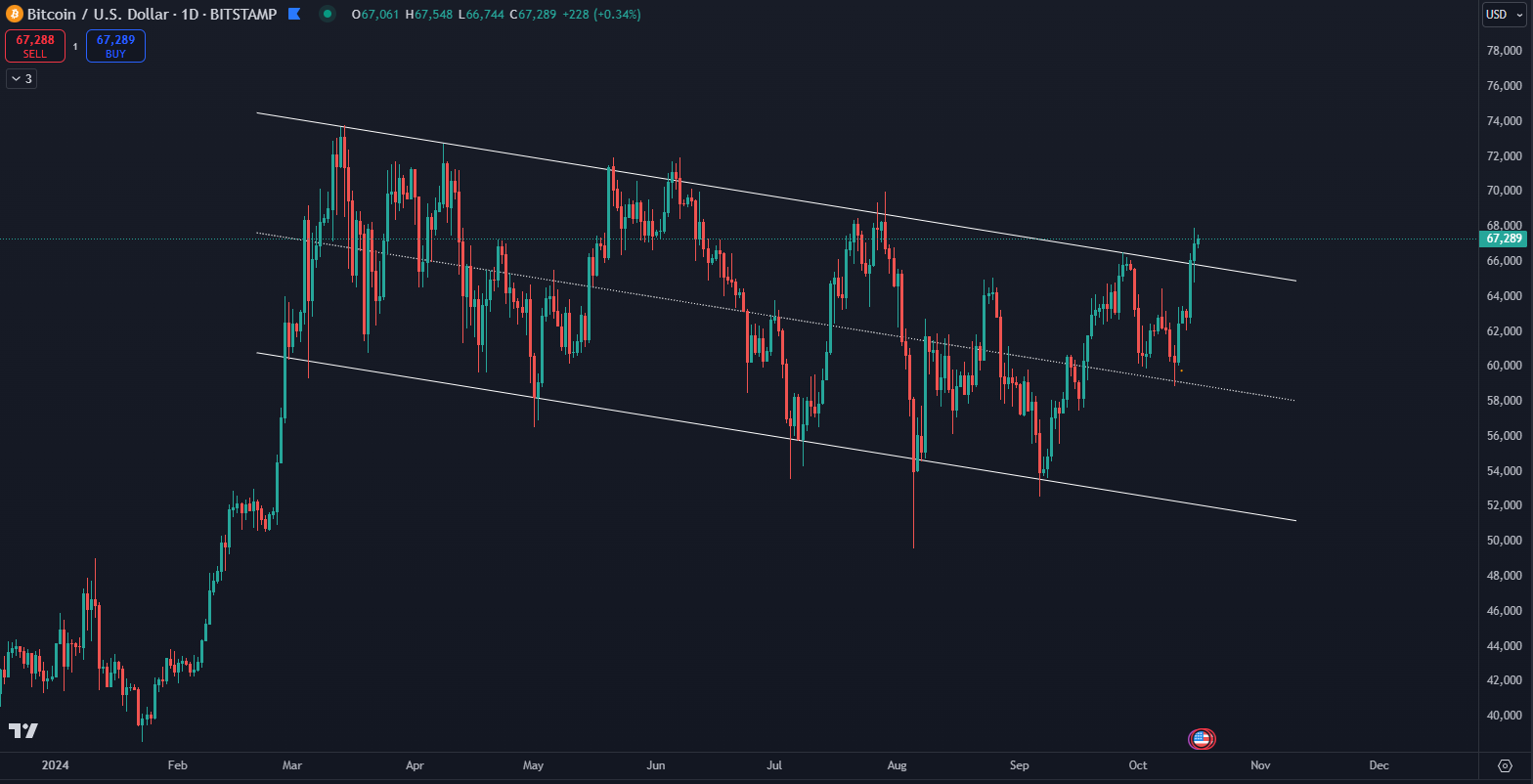 V čase písania článku sa Bitcoin podľa údajov TradingView obchoduje za 67 290 dolárov a prelomil hranice odporu, ktoré sledovali analytici. Napriek tomu si mnohí myslia, že ide o falošné prelomenie.