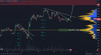Biele línie reprezentujú rezistenciu z krátkodobých lokálnych maxím a ich prekonávanie znamená, že bitcoin chytá bullish momentum. Ak sa mu podarí prelomiť obidve tieto rezistencie, ďalším pásmom obratu by mohla byť zóna s vysokými transakčnými objemami od 32 500 do 36 500 dolárov.