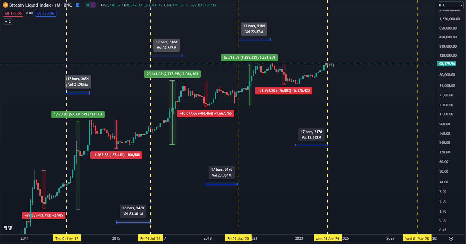 Z dlhodobého hľadiska sa trend rozdeľuje na 3 základné fázy: navýšenie dopytu, korekcia, akumulácia. V súčasnosti sa trh kryptomien nachádza v strede fázy navýšenia dopytu, a to na základe halvingu, keďže ten nastal v apríli a ceny väčšinou stúpajú minimálne rok pred a po tejto udalosti.