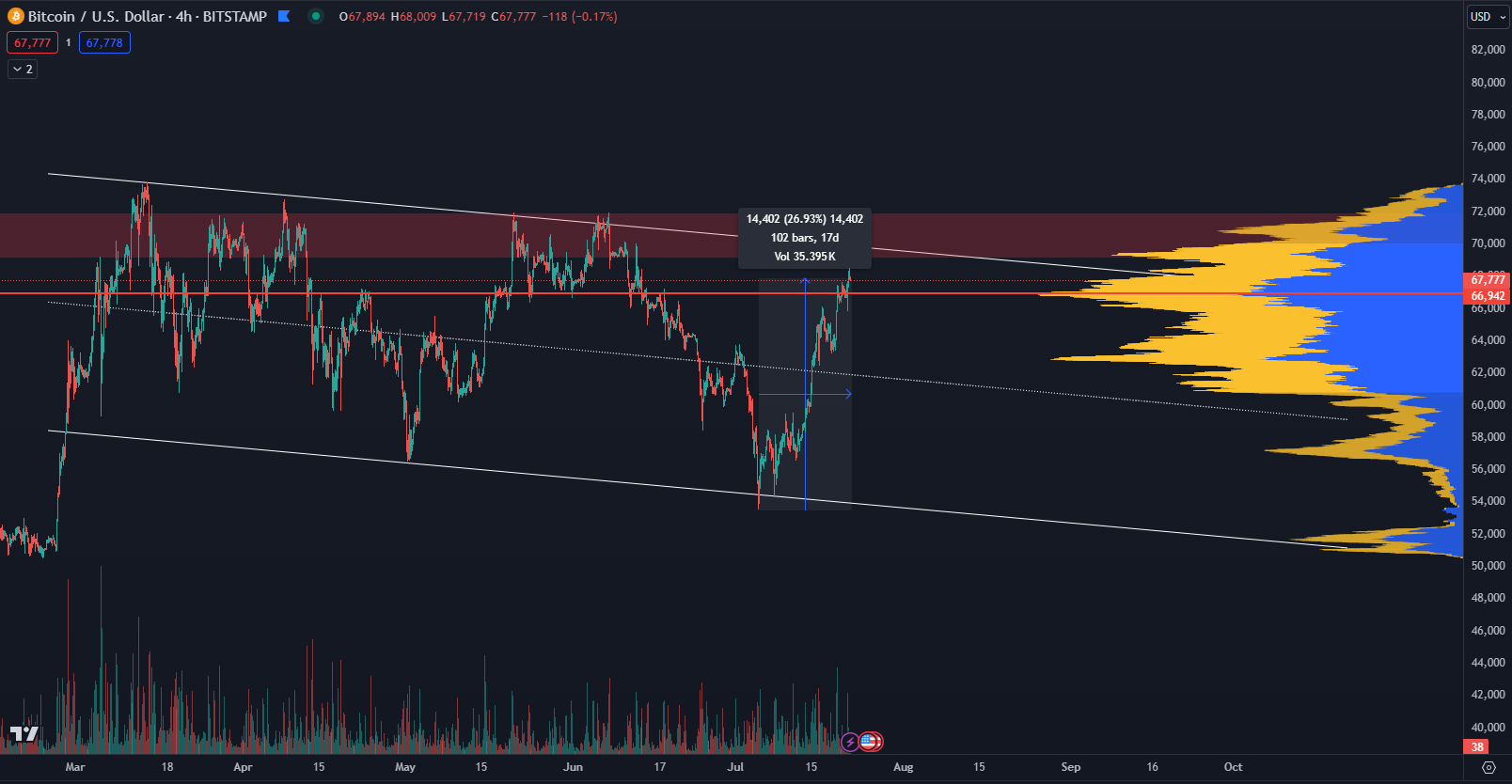 Posledná zóna odporu je medzi 70 000 a 72 000 dolármi. Táto zóna je zároveň oblasťou rezistencie vlajky, ale predstavuje aj posledné obchodné objemy pod historickým maximom. Tento signál je preto kľúčový pre ďalšie formovanie trendu pre najbližší mesiac. Naopak najbližší support sa nachádza okolo ceny 63 000 dolárov.