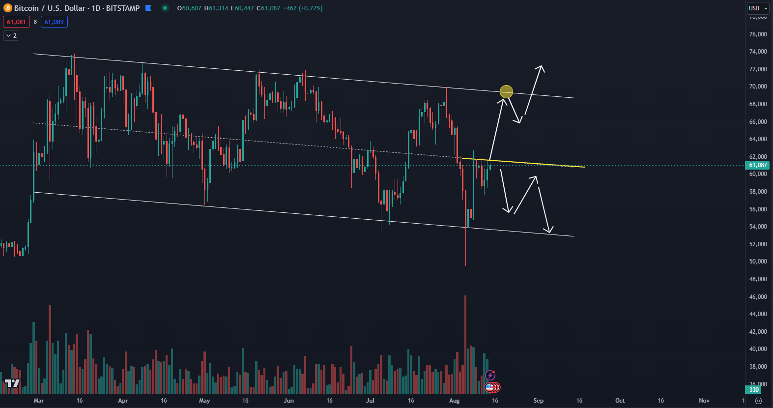 Najväčšia kryptomena na svete vytvorila historické maximum v polovici marca 2024 a odvtedy sa nachádza v klesajúcej štruktúre, ktorú nazývame klesajúca vlajka (biele línie). Táto štruktúra by sa mala podľa teórie ukončiť prerazením rezistencie a pokračovaním rastu. Zatiaľ to však nie je isté.