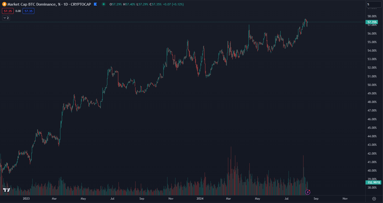 Jediné obdobie, kedy od začiatku roka 2023 prudko rástli ceny altcoinov, bol prvý kvartál roku 2024. Vtedy sme mohli vidieť miernu stagnáciu dominancie BTC, no aj tak nezačala klesať. Dominancia potom opäť rástla, pretože keď Bitcoin stiahne ceny nadol, väčšinou altcoiny utrpia omnoho väčšiu porážku.