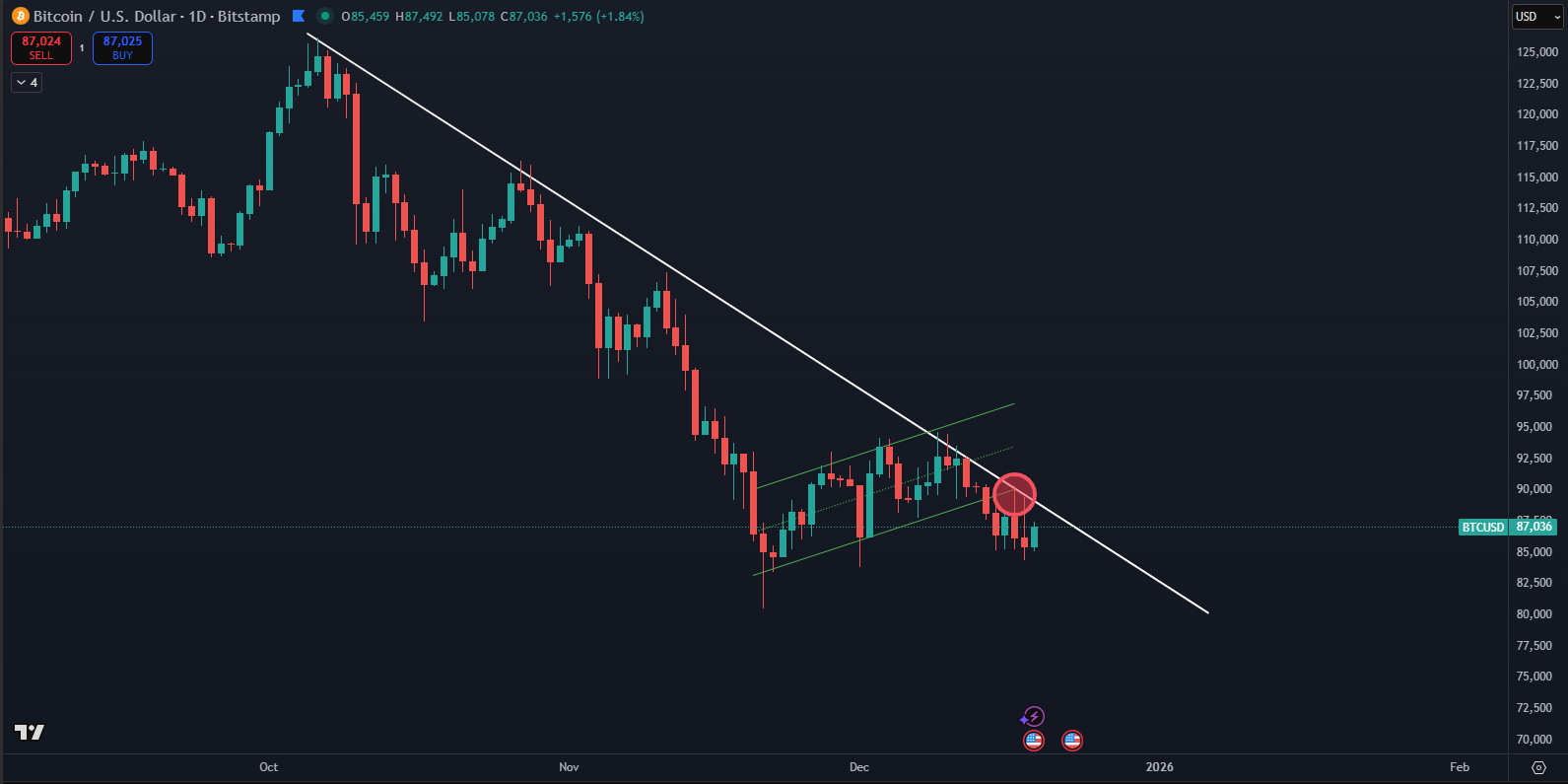 Bitcoin vstúpil do posledných týždňov s výrazne zmenenou dynamikou, ktorú si investori nemohli nevšimnúť. Po prudkej korekcii o 36 % sa cena prepadla až k úrovni 80 000 dolárov, čím trh prešiel fázou silného vytriezvenia. Od 21. novembra však vývoj nabral iný smer. Cena sa podľa TradingView odrazila a začala vytvárať mierne rastúci kanál, ktorý na prvý pohľad pôsobil stabilne.