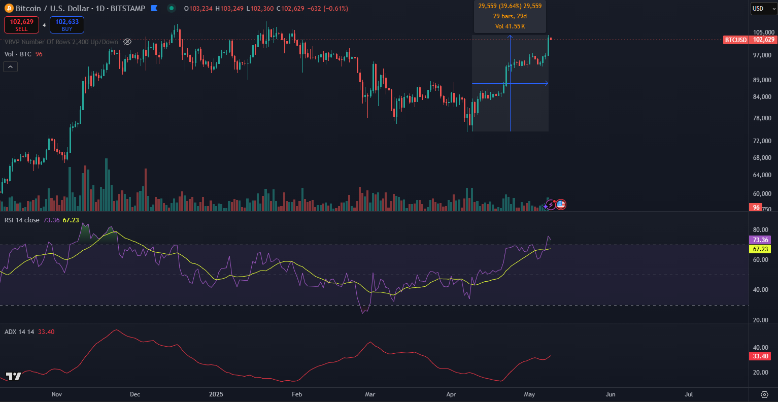 Kryptomeny vstupujú do novej éry ziskov. Podľa magazínu Crypto News dominancia Bitcoinu na trhu kryptomien dosiahla 65,7 %, čo je najvyššia úroveň od januára 2021. Cena Bitcoinu sa vyšplhala na 104 000 dolárov, čo predstavuje nárast o 40 % za jediný mesiac, ukazujú údaje z TradingView.