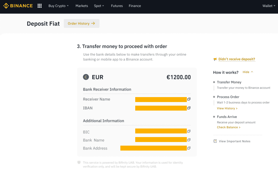 Nákup Bitcoinu a iných kryptomien sa na burze Binance skladá z dvoch častí. Prvým krokom je vklad vo fiat mene, napríklad v eurách alebo dolároch, v druhom kroku za vložené peniaze môžeme na burze okamžite a s veľmi nízkym poplatkom urobiť nákup. Vklad cez SEPA nie je spoplatnený. Burza síce udáva, že táto akcia je iba dočasná, ale môže to takto zostať aj dlhodobo, ako to bolo aj pôvodne pred takmer ročným pozastavením vkladov týmto spôsobom. Treba ešte dodať, že každý používateľ burzy Binance musí mať overený účet cez KYC, aby mohol nakupovať a obchodovať. Celým procesom založenia a overenia účtu ťa bude sprevádzať tento návod: Ako overiť účet na burze Binance – návod krok po kroku.