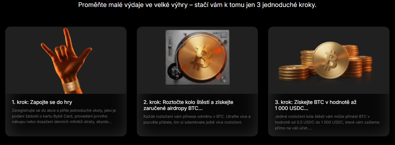 - V prvom kroku sa používateľ zaregistruje do promo akcie a plní základné úlohy. Medzi nich patrí podanie žiadosti o kartu Bybit Card, uskutočnenie prvého nákupu alebo dosiahnutie denných míľnikov útraty. Za každú splnenú úlohu účastník získava lístky, ktoré slúžia ako vstupenka do hry.