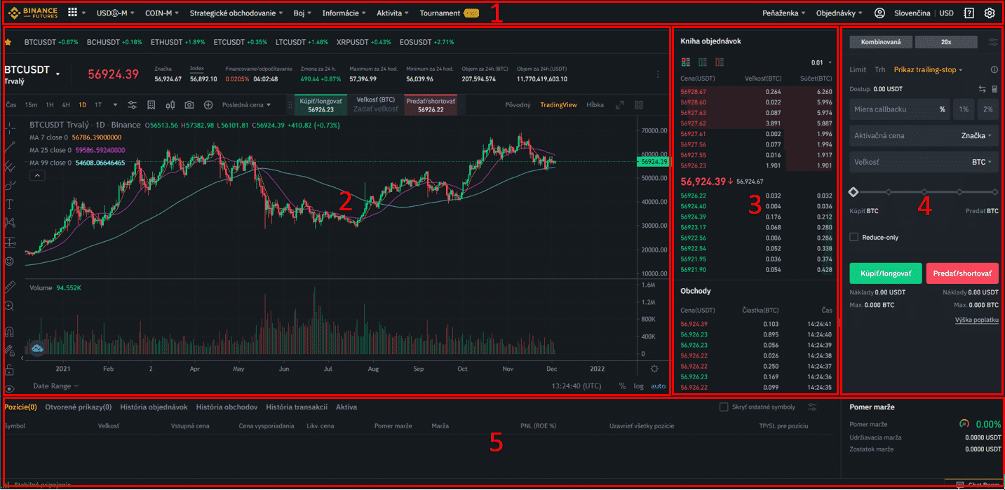 V tejto kapitole sa pozrieme na jednotlivé časti obchodnej platformy burzy Binance futures. Pre lepšiu vizualizáciu a pochopenie rozhrania budeme používať obrázok nižšie.