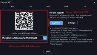 Vložiť prostriedky na burzu PrimeXBT je pomerne jednoduché. Na domovskej stránke v sekcii Main – Dashboard vidíme jednotlivé kryptomeny, ktoré je možné vložiť na účet burzy PrimeXBT. Burza aktuálne podporuje iba Bitcoin, Ethereum, USDT, USDC a ich vlastný coin Convesting.