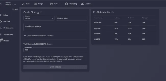 Hneď môžete vidieť niekoľko prvých stratégií, ktoré viete kopírovať. Minimálny vklad v prípade kopírovania stratégie je 0,001 BTC a pripojiť sa na stratégiu dokážete jednoducho cez stlačenie políčka Follow. Naopak, ak chcete zdieľať svoju stratégiu a úspechy z obchodovania, tak je potrebný minimálny vklad 0,1 BTC. Váš vklad do danej stratégie je zároveň kapitál, s ktorým obchodujete. Okrem zisku z kopírujúcich stratégií obchodujete aj so svojim kapitálom na vlastnom copy trading účte. Na vašu stratégiu sa však nenapojí len tak hocikto. Musíte mať za sebou výsledky a skúsenosti.