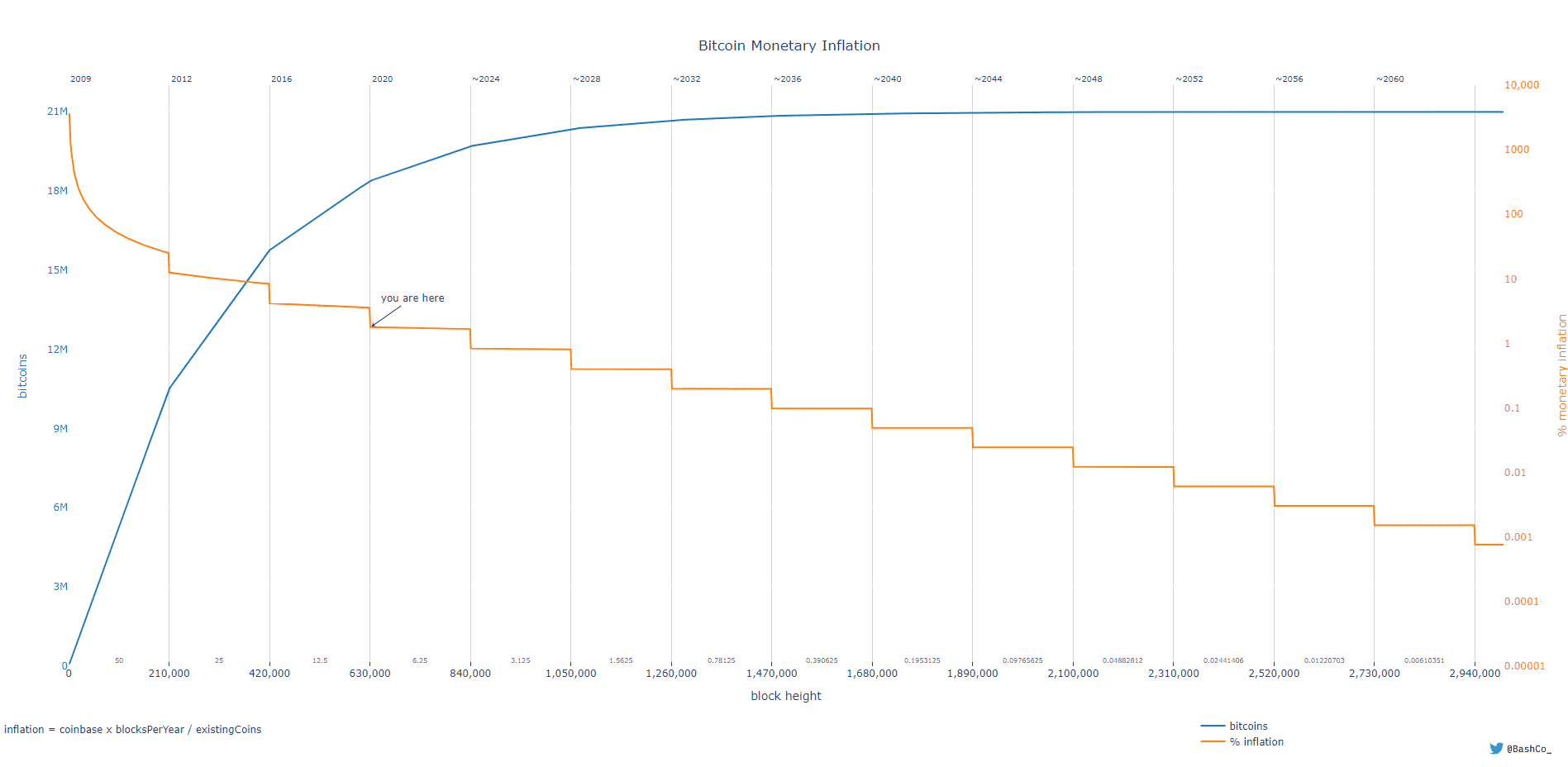 Celková ponuka Bitcoinu (modrá) v porovnaní s mierou peňažnej inflácie (oranžová). Zdroj: bashco