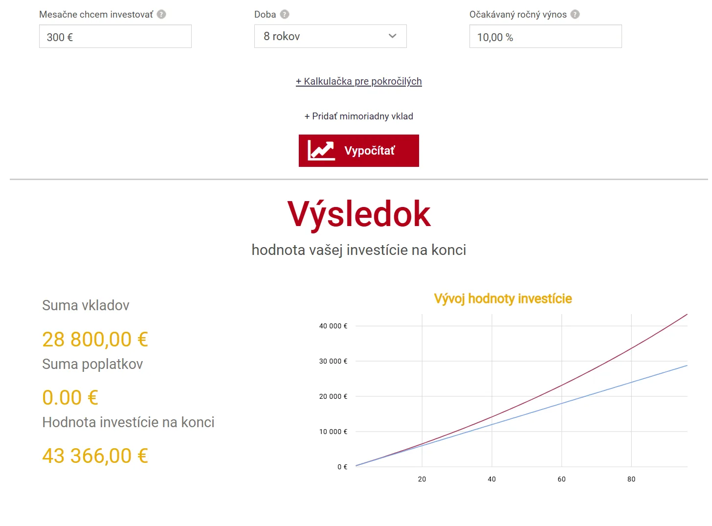 Pre získanie takejto sumy potrebujete napríklad investovať 300 eur mesačne počas 8 rokov pri očakávanom ročnom výnose 10 %. Ak už máte niečo našetrené, napríklad 20 000 eur, stačí vám investovať identickú sumu 300 eur mesačne len 5 rokov.