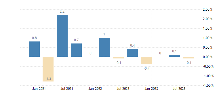 Slovensko je štvrtá najzávislejšia krajina od Nemecka hneď po Českej republike, Maďarsku a Holandsku. Dianie v najväčšej európskej ekonomike sa preto bezprostredne týka aj Slovákov. Okrem stavebníctva Nemecko čelí aj poklesu celkovej priemyselnej produkcie. Výsledkom je, že stagnuje aj rast HDP, ktorý vidíme na grafe nižšie. V treťom štvrťroku 2023 sa ekonomika prepadla o 0,1 % a balansuje na hranici recesie.