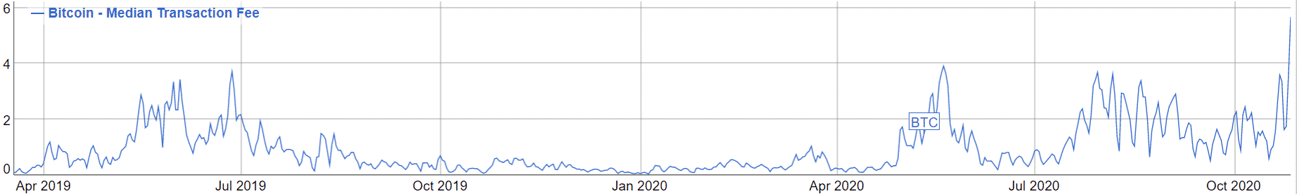 Bitcoin blockchain v posledných dňoch zaznamenal výrazný nárast transakcií, a teda aj transakčných poplatkov. Medián sa aktuálne pohybuje okolo šiestich dolárov (5 €) a priemerné hodnoty sú ešte vyššie, cca 10 $ (8 €). To už je naozaj dosť veľa, pretože niektoré burzy vám zaúčtujú priemernú hodnotu.