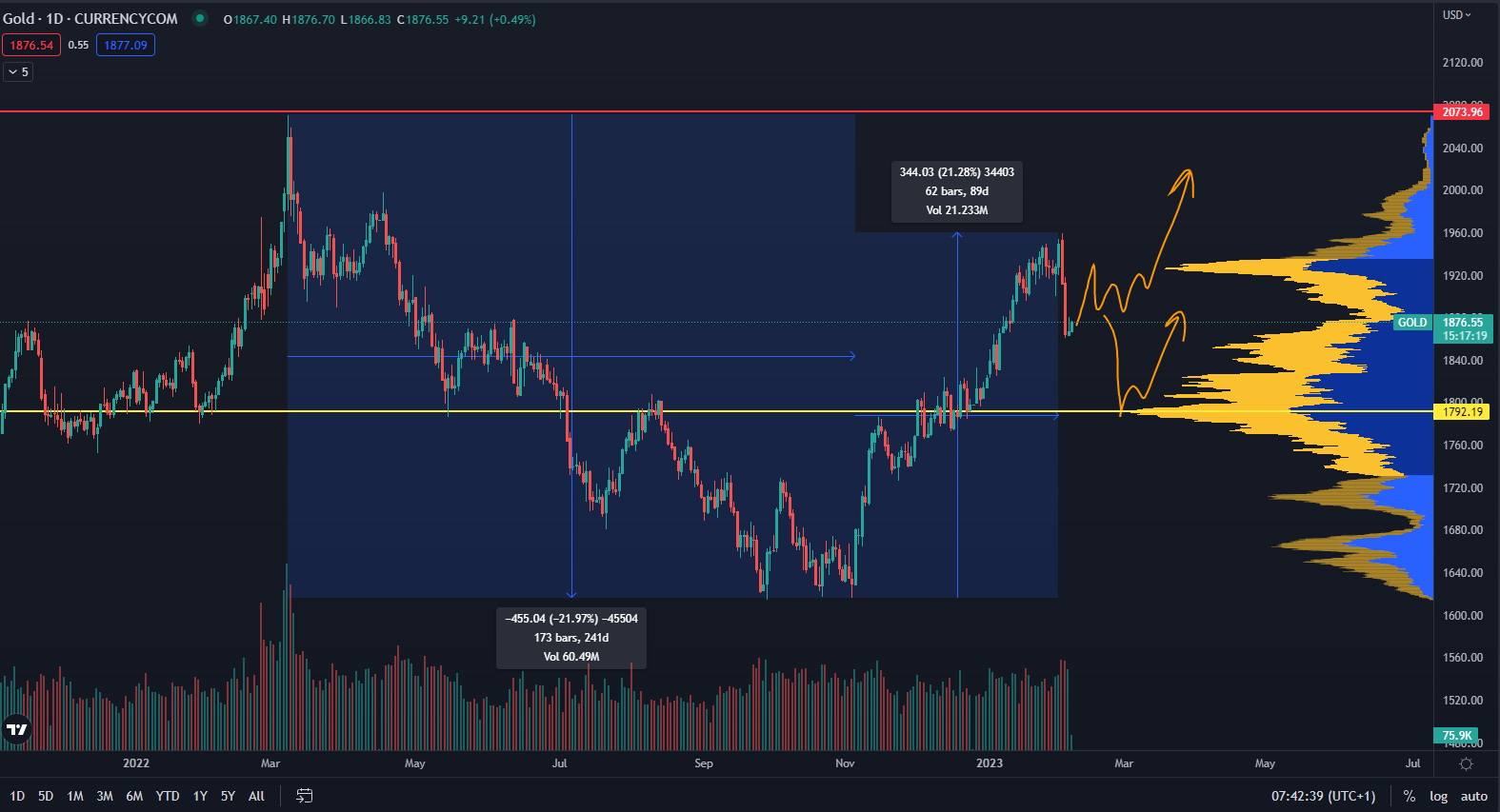Najbližší support môžeme sledovať na úrovni 1 800 dolárov, kde sa nachádza aj bod kontroly a zároveň najväčšie transakčné objemy. Historické maximum zlata je na úrovni 2 074 dolárov a cena by musela narásť o 10,70 % zo súčasnej hodnoty aby bolo vytvorené vyššie. Kúpyschopnosť zlata by ale tesne po prekonaní historického maxima bola stále nižšia, o čom sa môžete dočítať viac v našom článku Čoskoro sa prepíše história: zlato smeruje na nové maximum.