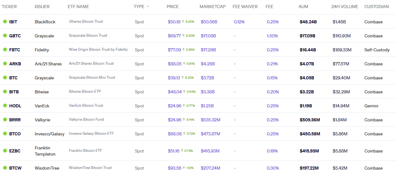 Zoznam spotových BTC ETF. Zdroj: blockworks.co