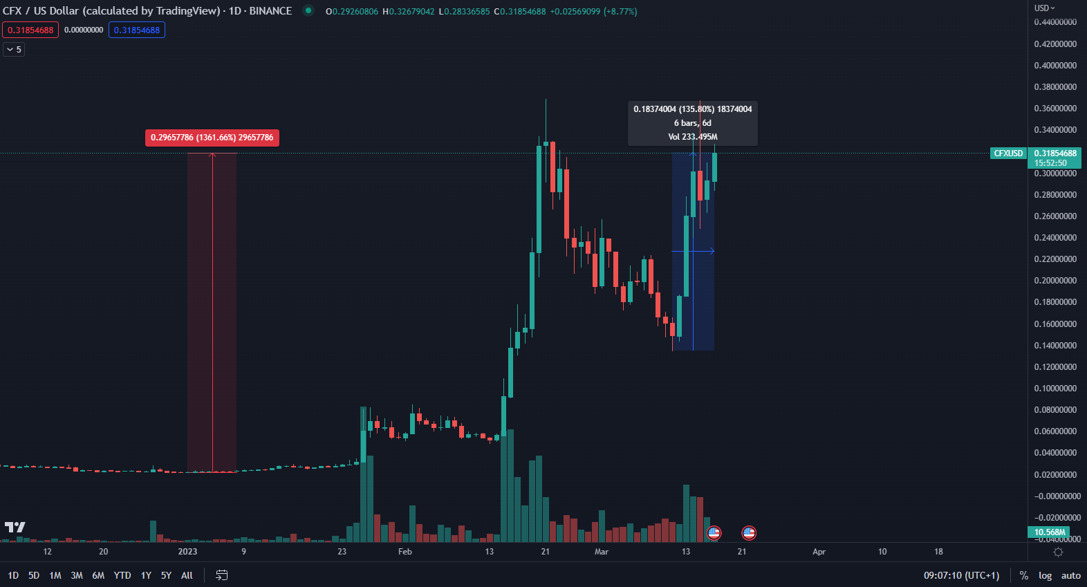 Ako vidíme na grafe nižšie, CFX sa obchoduje na trhovej cene 0,318 dolára, čo predstavuje nárast až 1 350 % v priebehu roka 2023. Navyše po korekcii sa cene podarilo vymazať celý prepad a za posledný týždeň sa zhodnotila o 135 %. Cena narazila na predošlé maximum a zatiaľ sme svedkami formovania dvojitého vrcholu.