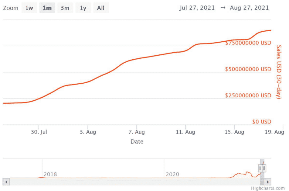 August sa stáva rekordným mesiacom predaja NFT, na ktoré sa za posledných 30 dní vynaložilo takmer 900 miliónov dolárov. Podľa údajov sledovacieho portálu Nonfungible bolo na NFT za posledných 30 dní vynaložených 896 miliónov dolárov. Je veľmi pravdepodobné, že toto číslo do konca mesiaca prekročí 900 miliónov dolárov, čo predstavuje nový rekord v rýchlo sa rozvíjajúcom odvetví.