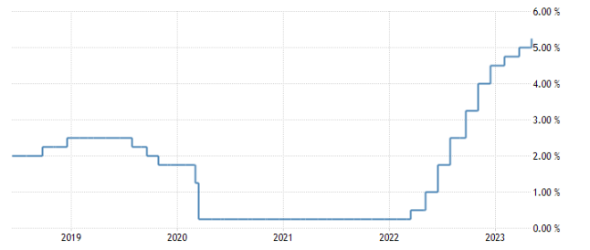 FED aj po 14-mesačnom neustálom zvyšovaní úrokových sadzieb pokračuje v navyšovaní a hodnota hlavnej úrokovej sadzby sa zvýšila z 5 % na 5,25 %. Hlavným cieľom Americkej centrálnej banky je naďalej bojovať s infláciou a potlačiť ju na dlhodobý cieľ pod 2 %.