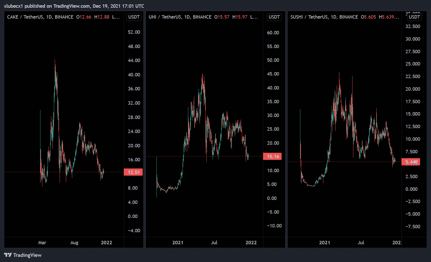 Hlavné altcoiny z DeFi sveta zažívali posledné mesiace búrlivé obdobie. Ani jeden zo silnej trojice UNI, SUSHI a Cake nie je od minulého ATH v zisku. Dokonca na grafoch môžeme vidieť presný opak, a to veľký pokles. Sushi sa z 22 USD prepadol na približne 5 USD, čo je 80-percentná strata. Cake je na tom prakticky rovnako – pokles z maxima 44 USD na 11 USD, čo je rovnako strata približne 80 %. Najlepšie sa darí kryptomene UNI, ktorá stratila „iba” 70 % a prepadla sa zo 44 USD na približne 15 USD.