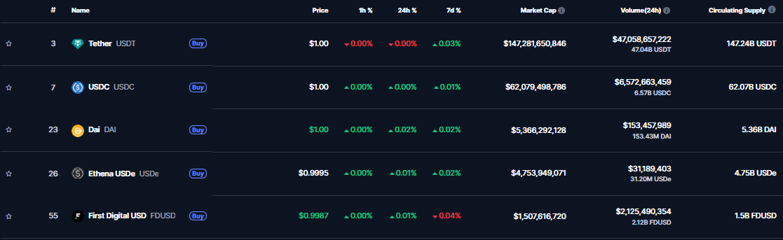 5 najväčších stablecoinov na svete. Zdroj: coinmarketcap.com