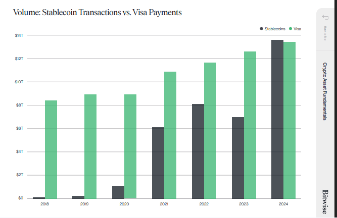 Objem stablecoinov verzus Visa. Zdroj: bitwiseinvestments.com