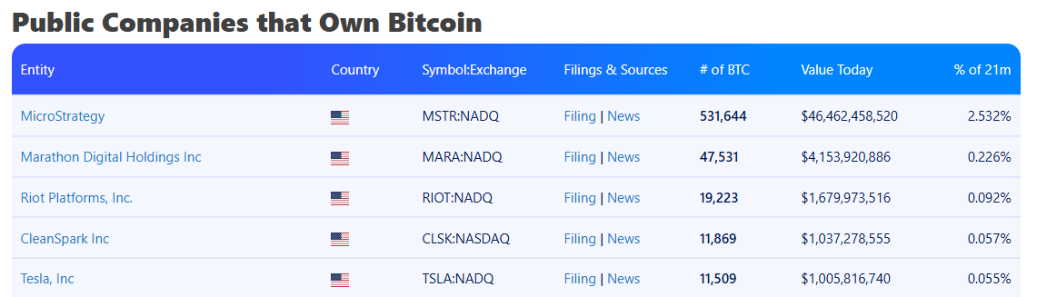 Strategy, známa ako Microstrategy, zostáva najväčším držiteľom, nasledovaná spoločnosťou MARA Holdings. Riot Platforms, Cleanspark a Tesla dopĺňajú päť najväčších firemných držiteľov, ukazujú údaje Bitbo.