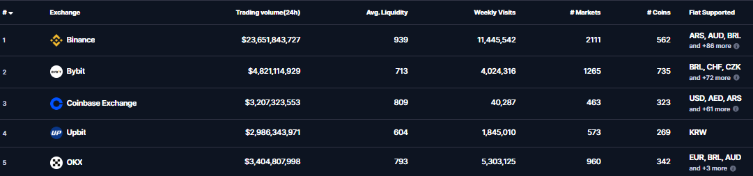 Binance je najväčšia krypto burza. Zdroj: coinmarketcap.com
