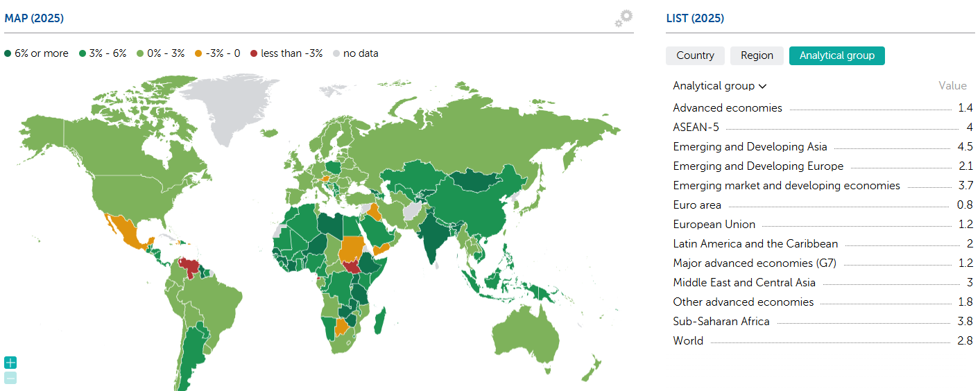 Svetová ekonomika má podľa aktuálnej prognózy MMF rásť len o 2,8 % v tomto roku, čo je výrazne menej než 3,3 %, ktoré predpovedala januárová prognóza. Najväčší prepad zaznamenali Spojené štáty, kde sa očakávaný rast znížil z 2,7 % na 1,8 %, a Čína, ktorú zasiahli americké clá až do výšky 145 %, s poklesom prognózy zo 4,6 % na 4,0 %.