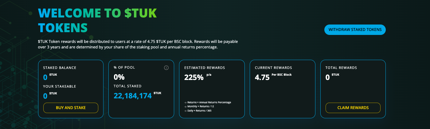 Pozadie platformy eTukTuk jednoznačne ponúka atraktívne a prospešné riešenia pre zdieľanú dopravu. No pre kryptoinvestorov bude ešte dôležitejšie budúce zhodnotenie tokenov TUK. Projekt z tohto dôvodu sprístupňuje možnosť stakingu tokenov za účelom ich budúceho zhodnotenia. Platí, že čím dlhšie budete tokeny stakovať, tým väčšie odmeny získate.