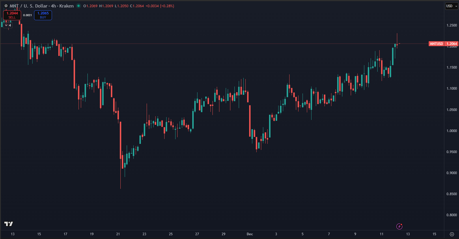 Podľa údajov TradingView dosahuje token Mantle cenu 1,20 dolára, pričom za posledné tri týždne vzrástol o 40 %. Ide o jeden z najziskovejších tokenov v rámci rebríčka top 100 za posledné týždne. Trhová kapitalizácia MNT dosahuje 3,91 miliardy dolárov, čo token zaraďuje na 26. miesto medzi najväčšími kryptomenami.