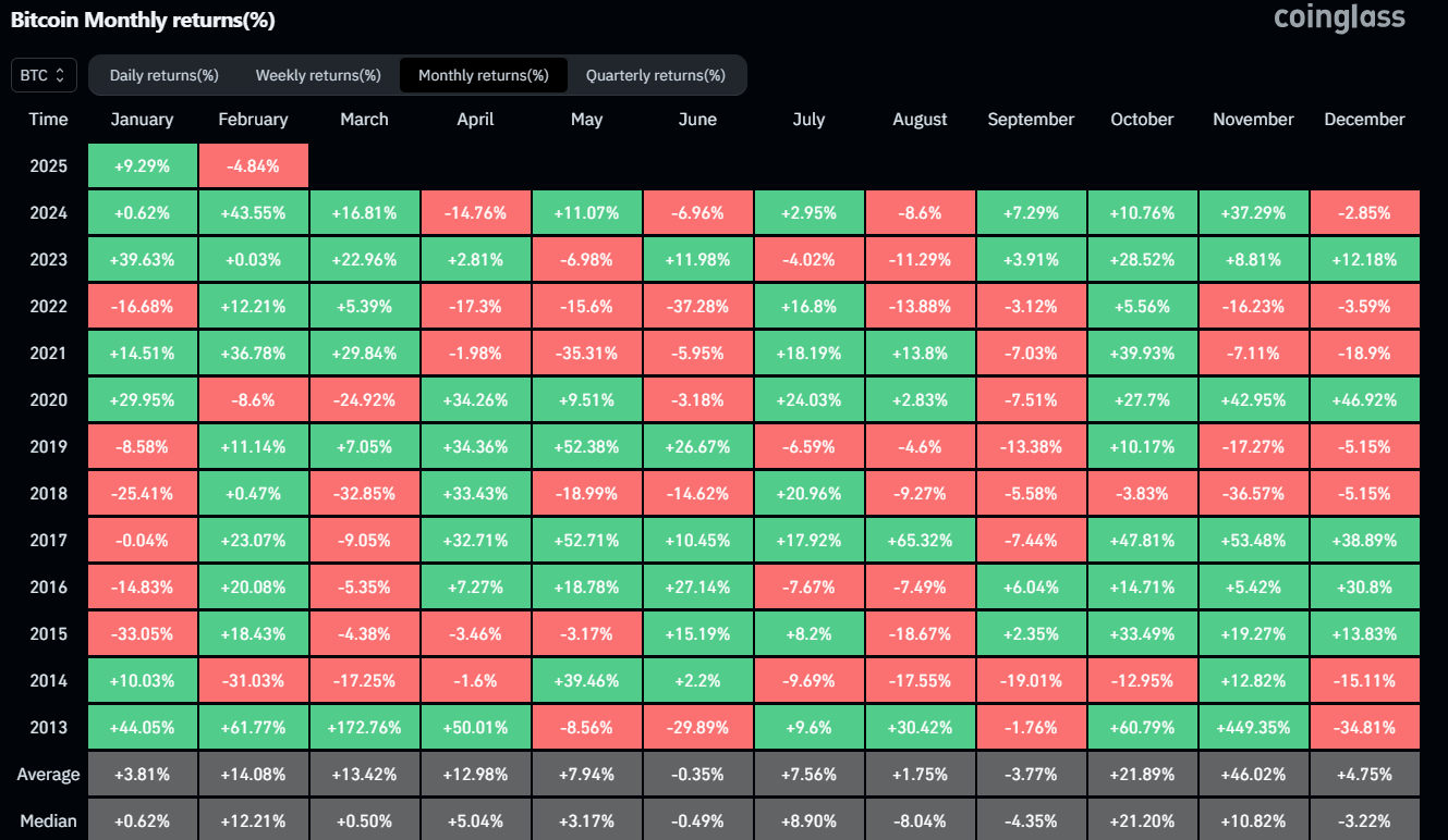Podľa údajov Coinglass máme detailný pohľad na priemerné mesačné zhodnotenie BTC od roku 2013. My si však vypočítame priemer z priemerov, aby sa nám lepšie počítalo s očakávaným ziskom. Jednoducho spočítame riadok priemerov a vydelíme 12. Celkový výsledok priemerného mesačného zhodnotenia je tak na úrovni 10,84 %.