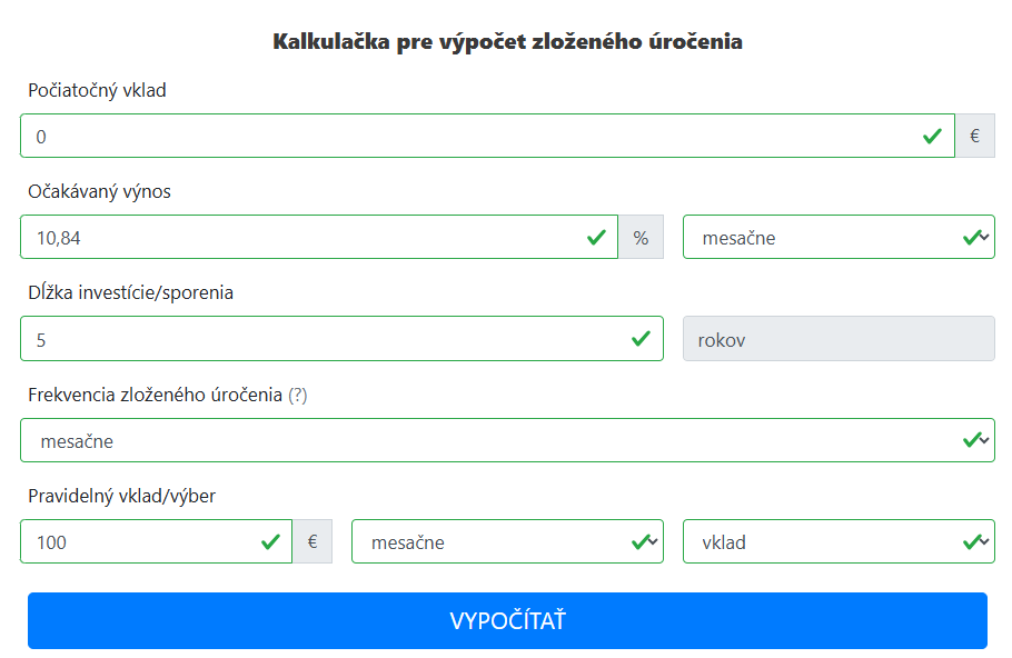V poslednom kroku nám stačí spojiť dva poznatky, ktoré sme sa naučili – stratégiu DCA a priemerné zhodnotenie BTC. Jednoducho vložíme do kalkulačky nasledujúce vstupné parametre: mesačné úročenie 10,84 % a pravidelný mesačný vklad 100 eur.