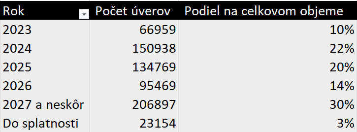 V najbližších troch rokoch podľa Národnej banky Slovenska (NBS) dôjde k refixácii približne polovice úverov. Priemerná splátka refixovaných úverov do roku 2025 je približne 270 eur. Pri raste sadzieb na úroveň 4,5 až 5 % bude zvýšenie splátky približne o 100 eur. Zhruba 15 % týchto úverov zaznamená nárast splátky o viac ako 200 eur.