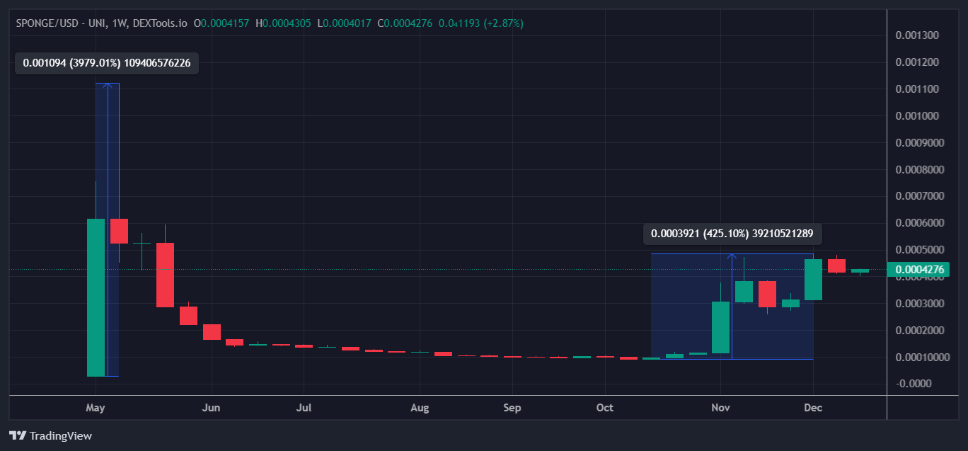 Počas nárastu ceny Bitcoinu nad 40 000 dolárov a nedávneho úspechu meme tokenov ako Bonk, token SPONGE zaznamenal nárast o viac ako 400 % v tomto štvrťroku, podnietený úspešnou airdropovou kampaňou v hodnote 100 000 dolárov a obchodnou súťažou pre držiteľov.