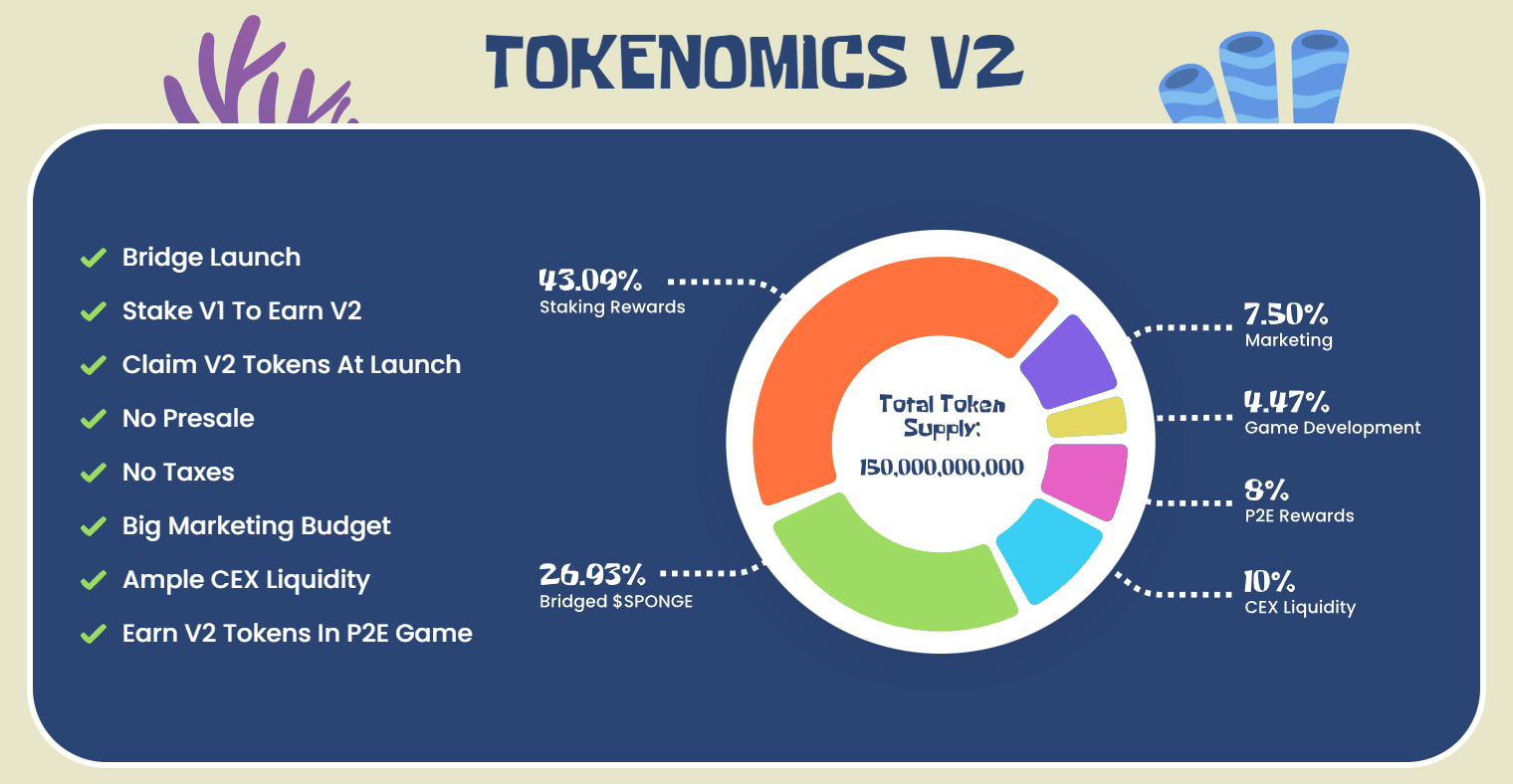 S cieľom byť väčším a lepším, token Sponge V2 opäť nemá transakčné dane, bude poháňať aplikáciu Sponge Game a ponúka niektoré z najvyšších odmien za staking na trhu.