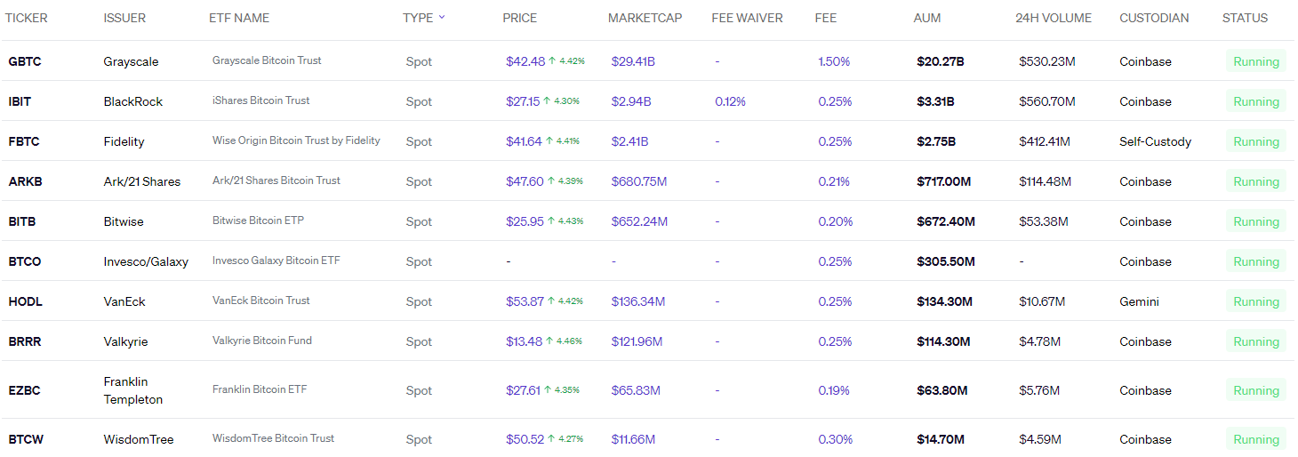 Podľa údajov spoločnosti Blockworks po Grayscale nasleduje Blackrock so správou 3,31 miliardy a Fidelity s 2,75 miliardami, pričom všetci ostatní správcovia nahromadili v bitcoinovom ETF menej ako 1 miliardu dolárov. V dennom objeme obchodov taktiež dominuje Grayscale, Blackrock a Fidelity s celkovou hodnotou približne 1,5 miliardy dolárov.