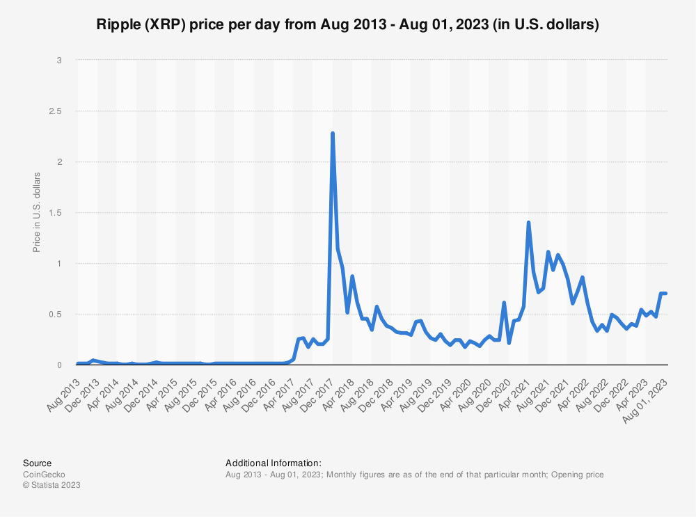 Na základe cenových štatistík portálu Statista od roku 2013 do roku 2017 zaznamenal XRP 22 700 % nárast ceny z 0,01 USD na 2,28 USD (pozrite si graf nižšie). V skutočnosti bolo denné maximum XRP na úrovni 3,84 dolára.