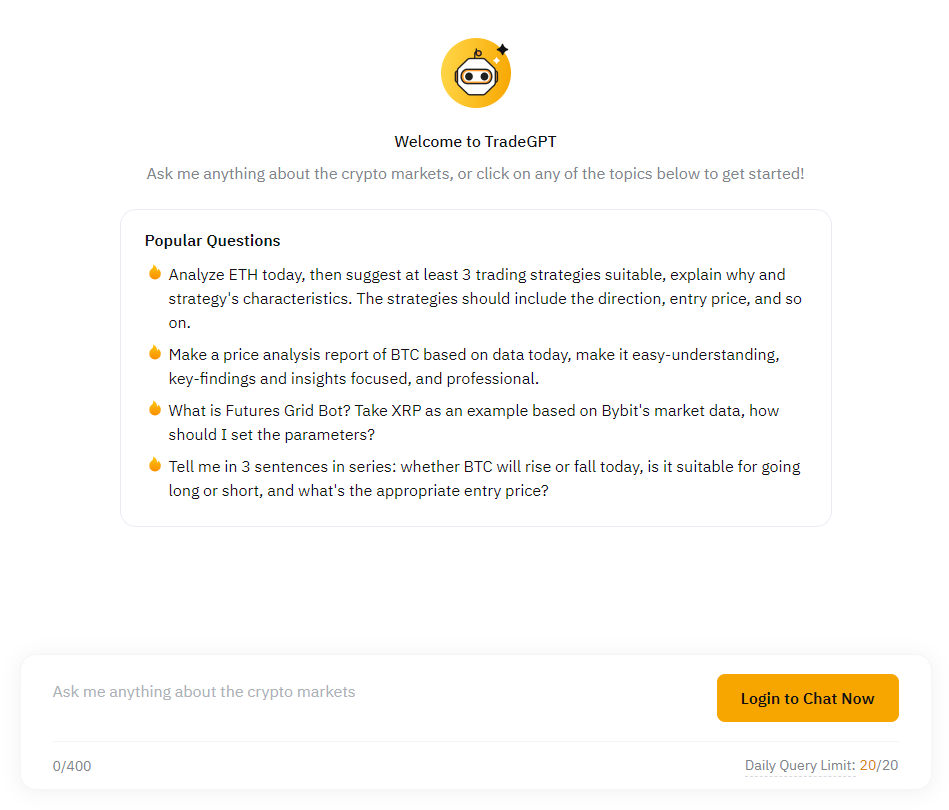 Tradegpt je súčasť balíka umelej inteligencie od Bybit s názvom Toolsgpt. Burza tvrdí, že Chatgpt má príslušné údaje iba do septembra 2021, no používatelia Tradegpt môžu získať hodnotenie trhu v reálnom čase a dostať odpovede hneď v niekoľkých jazykoch. Táto služba je pre registrovaných používateľov bezplatná. Bybit uvádza, že existuje limit 20 otázok na osobu na 1 deň.