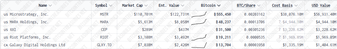 Firmy držiace najvyšší počet BTC. Zdroj: bitcointreasuries.net