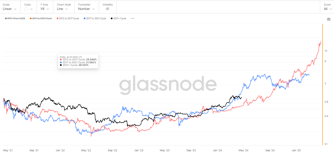 Nasledujúci graf porovnáva cenovú výkonnosť Bitcoinu od historických maxím z predošlého cyklu až do toho ďalšieho. A opäť vieme pozorovať, že súčasný cyklus (čierna krivka) je v porovnaní s dvoma predošlými úplne identický. Zároveň sa znovu potvrdzuje, že finálna fáza vzostupu stále nenastala.