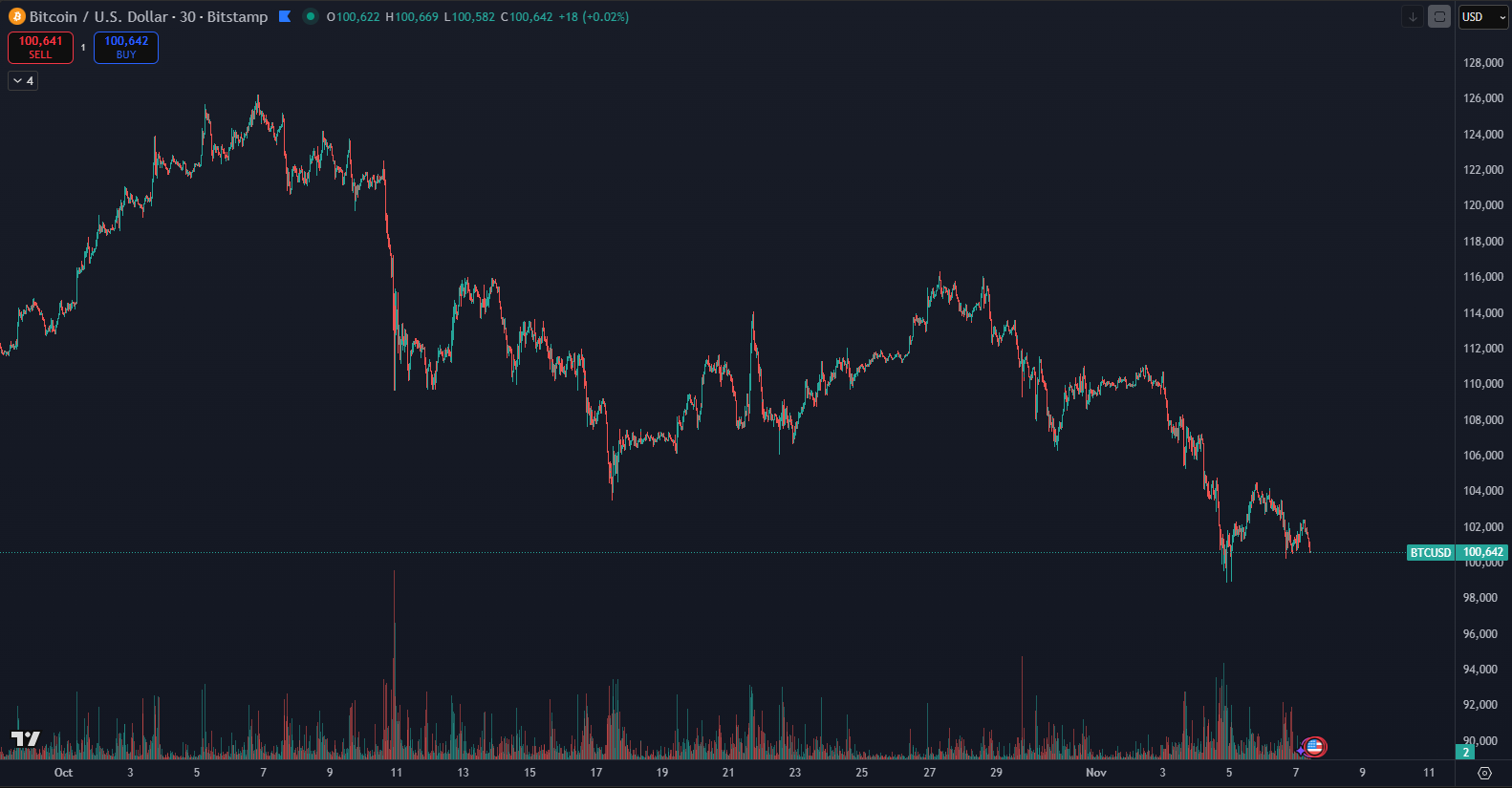 Presne pred mesiacom Bitcoin vytvoril svoje nové historické maximum na úrovni 126 200 dolárov. Trhová nálada bola euforická a investori očakávali pokračovanie rastu, pričom väčšina analytikov predpovedala prielom nad 130 000 dolárov. Avšak, ako to často býva, trh sa vydal opačným smerom. Keď nikto nečaká pokles, Bitcoin prekvapí a spustí korekciu. Počas posledných štyroch týždňov stratil približne 20 % svojej hodnoty a aktuálne sa obchoduje okolo 100 650 dolárov, ukazujú údaje z TradingView.
