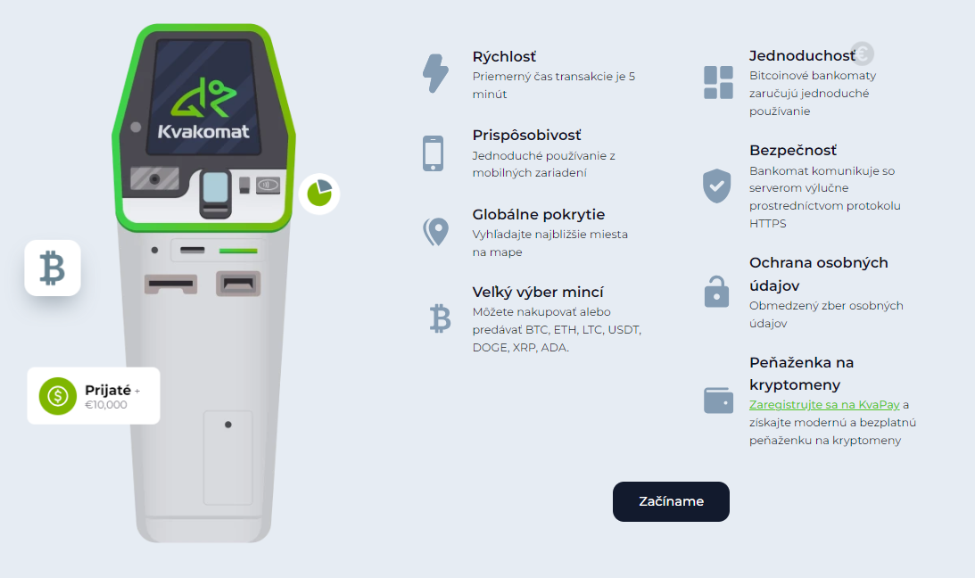 - Kvakomat je fyzický bankomat na rýchle nákupy kryptomien.