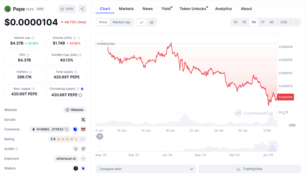 PEPE zaplavil trh, prinášajúc nevídané zisky raným investorom, ktorí sa pridali k memehype vlaku. Jeho explozívny debut spôsobil parabolické pohyby, ale tieto slávne dni sú už možno minulosťou. Keď počiatočný hype vyprchal, PEPE bojuje o udržanie záujmu, keď obchodníci prechádzajú na novšie a sľubnejšie tokeny.