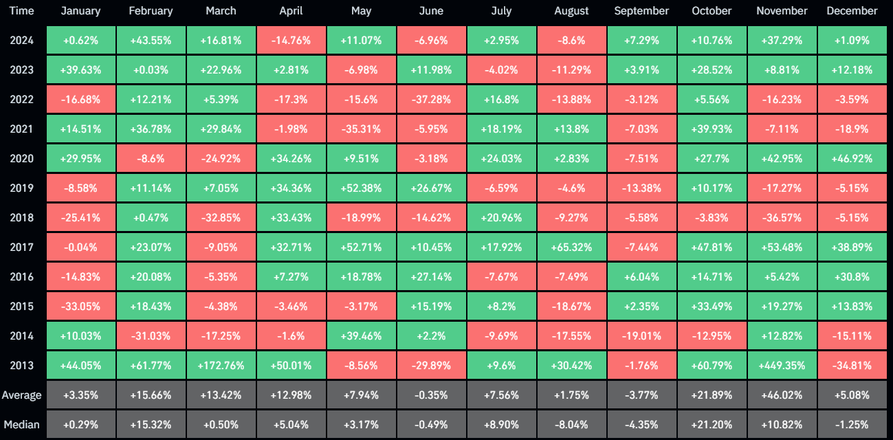 Priemerné mesačné zhodnotenie Bitcoinu. Zdroj: Coinglass