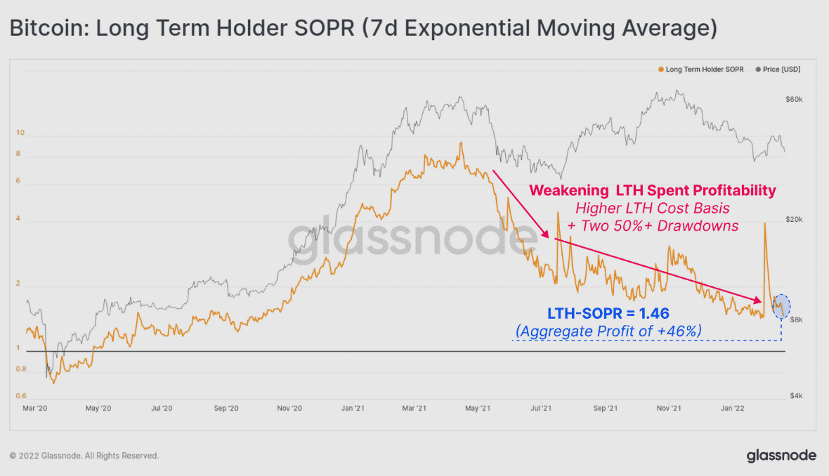 - Nižšie hodnoty LTH-SOPR indikujú zníženú ziskovosť utratených mincí. Zvyčajne ide o výsledok medvedej cenovej akcie.