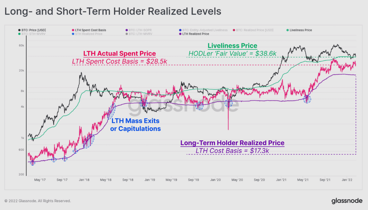 Použitím tohto konceptu LTH-SOPR ako „násobku realizovaného zisku” môžeme teda odhadnúť Spent Price LTH (ružová). Tento model odzrkadľuje priemernú cenu, za ktorú sa v minulosti akumulovali dnešné minuté LTH mince.