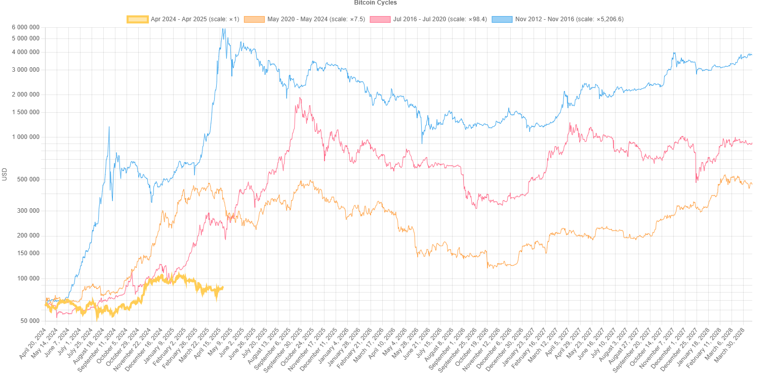 Bitcoinové cykly. Zdroj: bitcoincyclescomparison.com