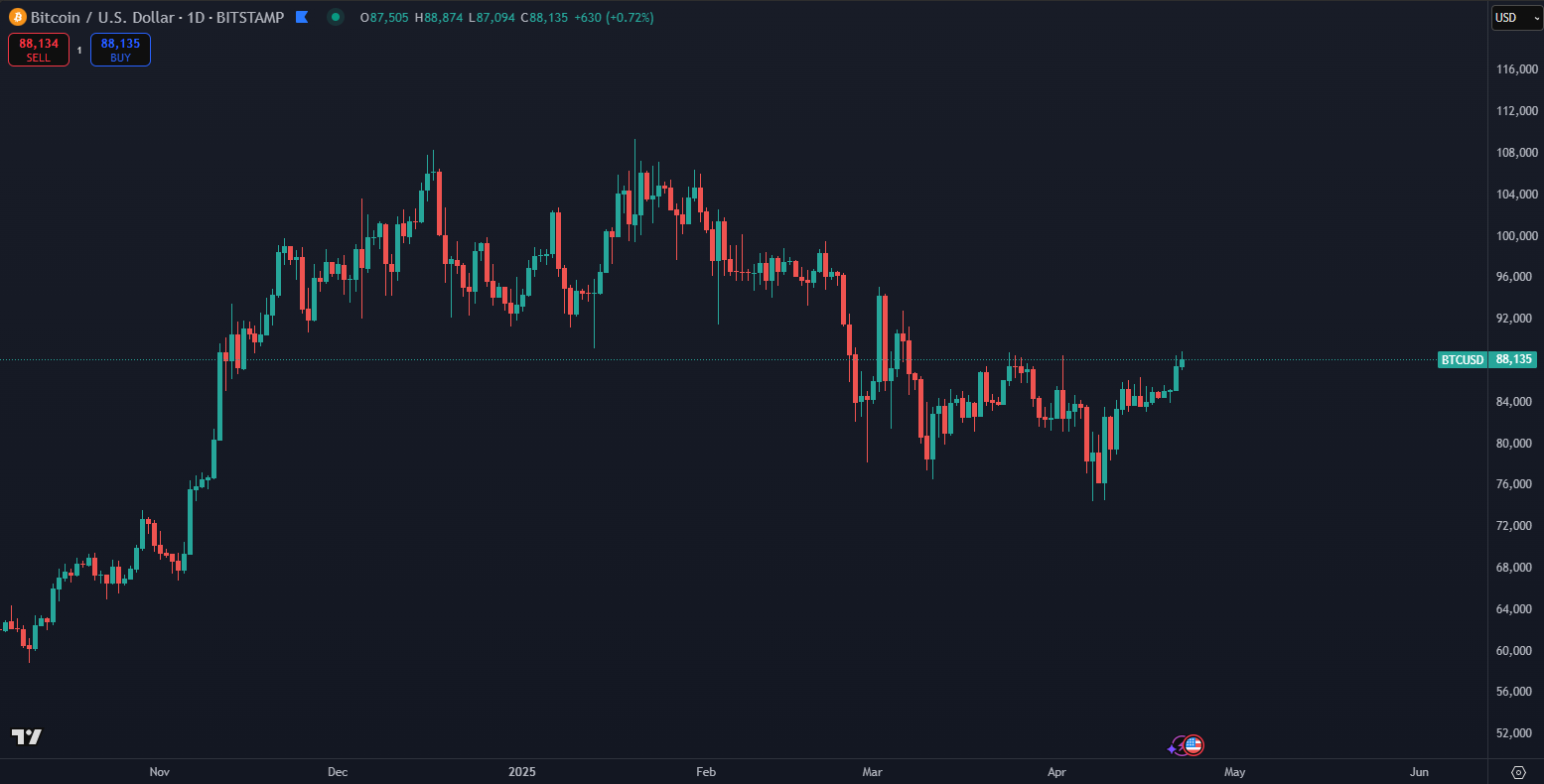 - Od 7. apríla 2025 cena BTC postupne rastie.