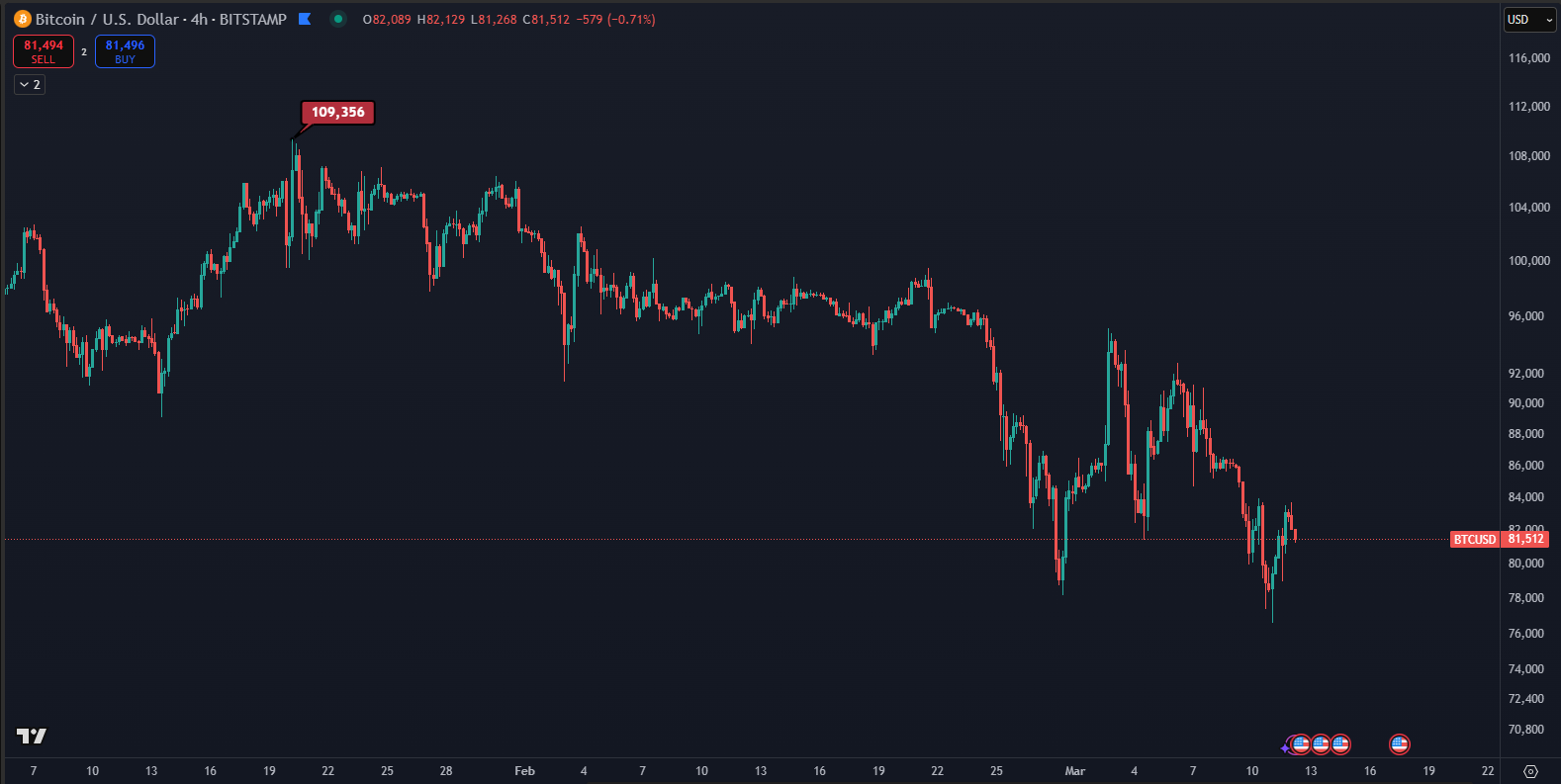 Pokles Bitcoinu od historického maxima. Zdroj: tradingview.com