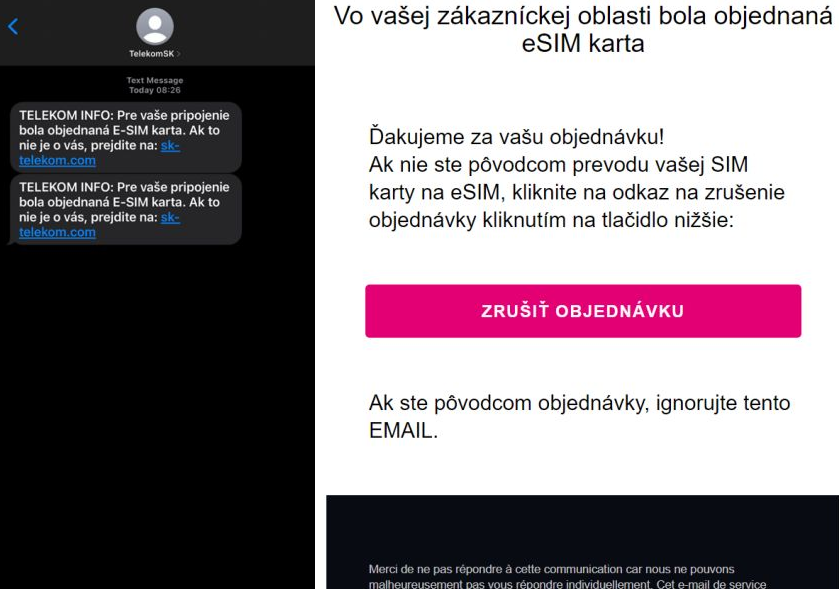Rovnako aj najväčší slovenský operátor Telekom upozornil svojich zákazníkov na podvod, ktorý zneužíva jeho značku. Zákazníci Telekomu dostávajú správy, ktoré ich informujú o potvrdení objednávky novej SIM karty.